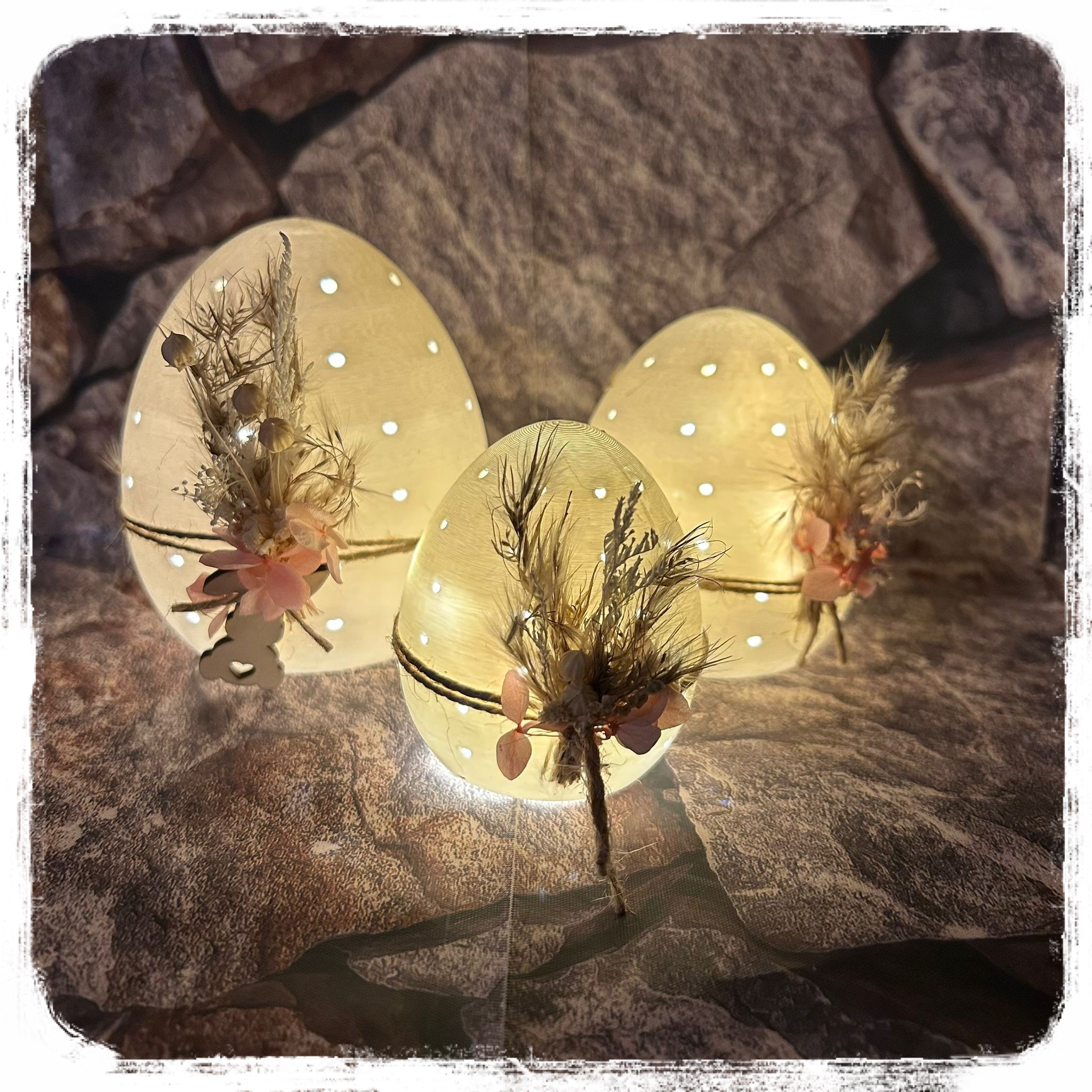 Leuchttrio-Ei mit Punkten und Trockenblumen je