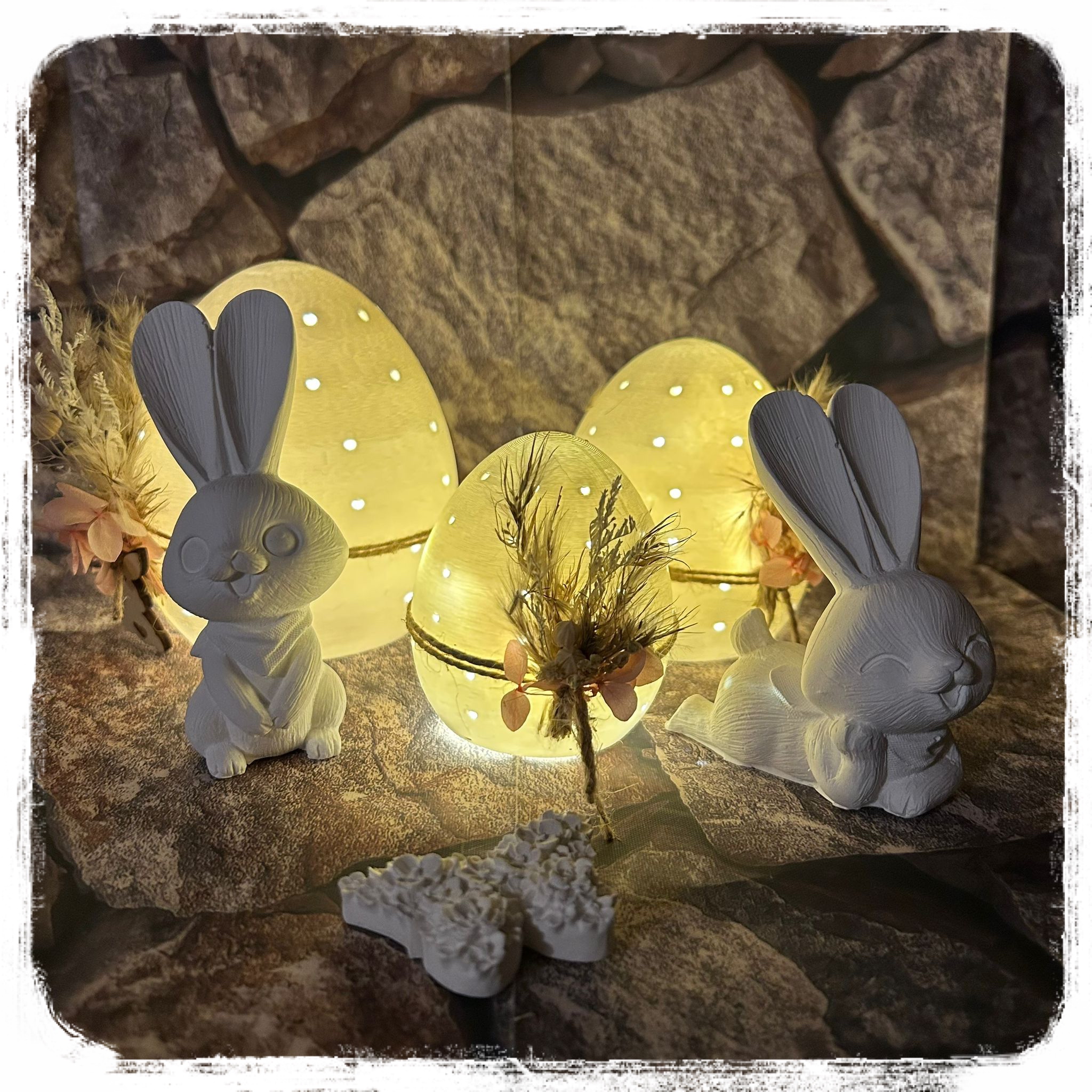 Windlicht, Trockenblumen und Häschen je